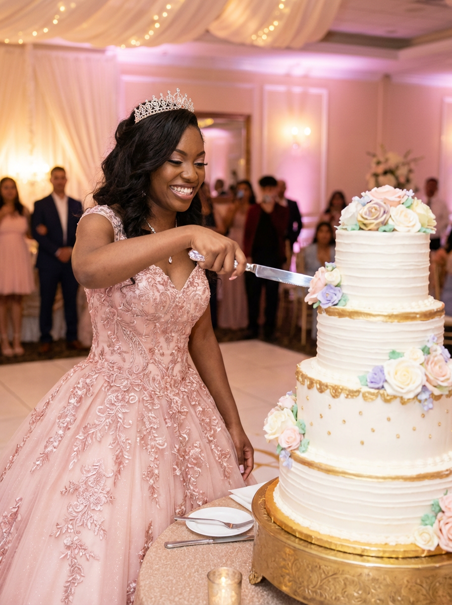 model with quinceanera cake, elaborate multi-tier design, cutting cake moment, beautiful gown visible