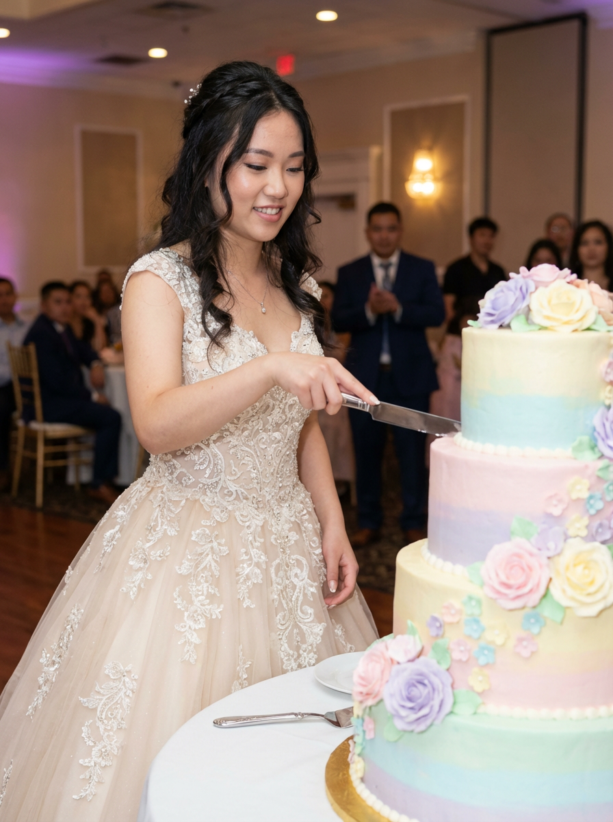 model with quinceanera cake, elaborate multi-tier design, cutting cake moment, beautiful gown visible