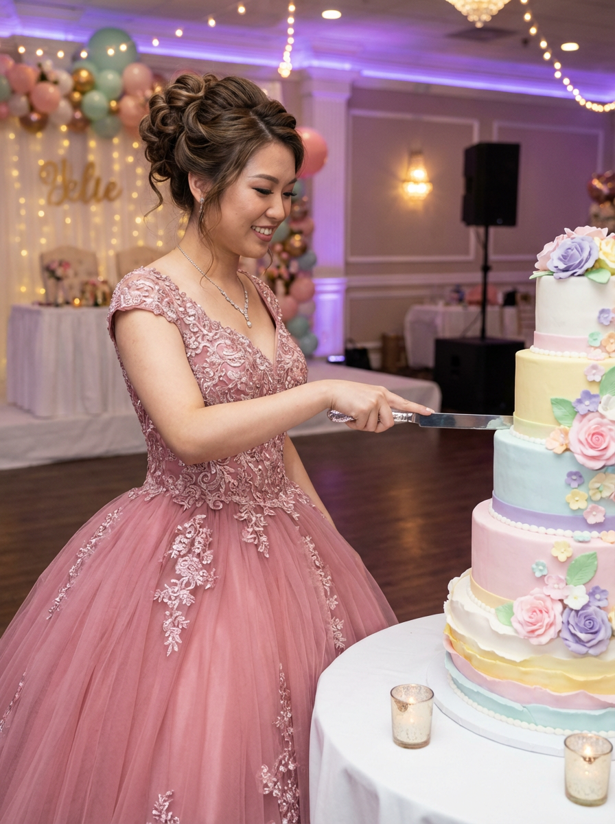 model with quinceanera cake, elaborate multi-tier design, cutting cake moment, beautiful gown visible
