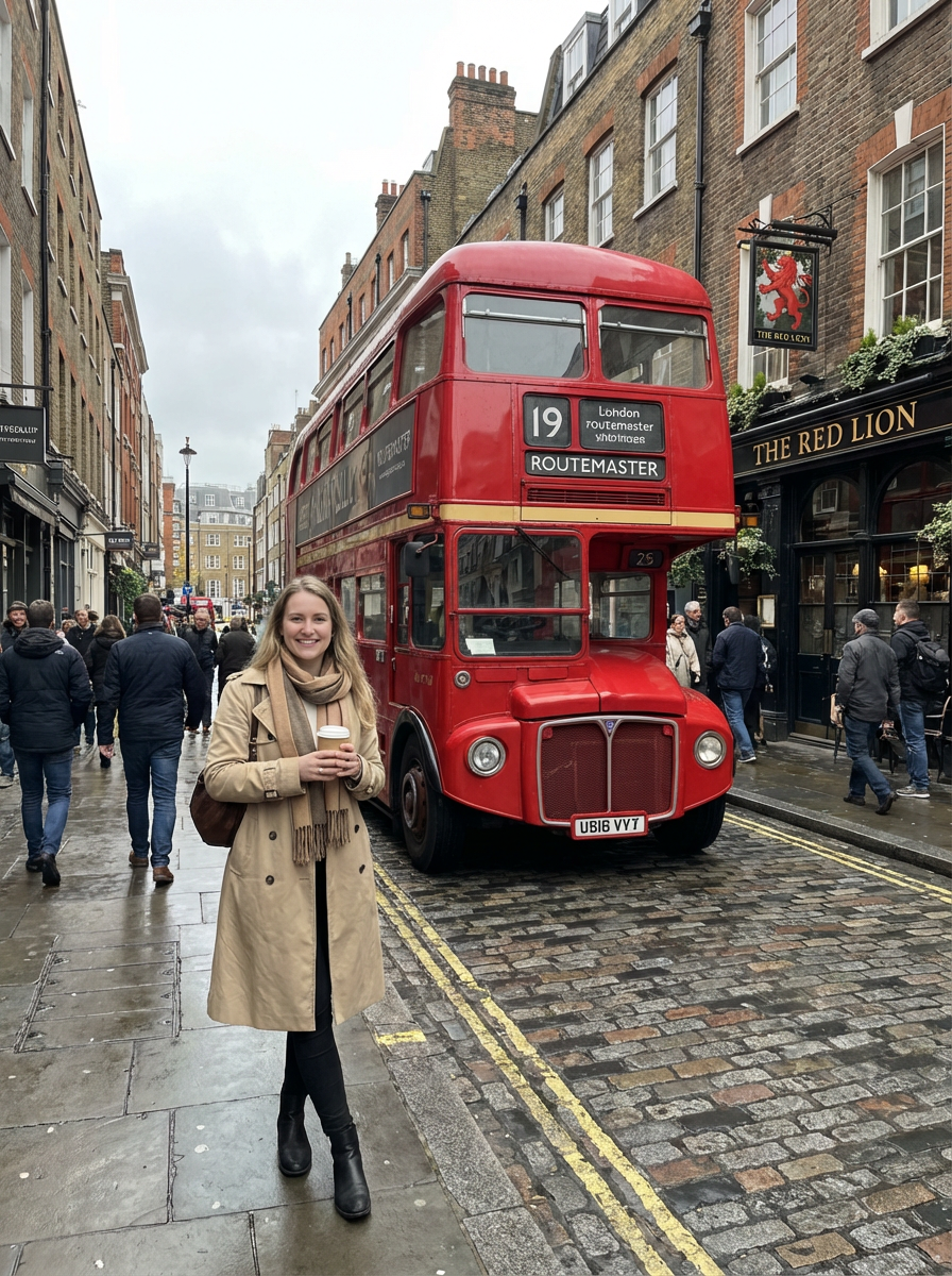 model with red double decker bus, London street scene, classic British aesthetic