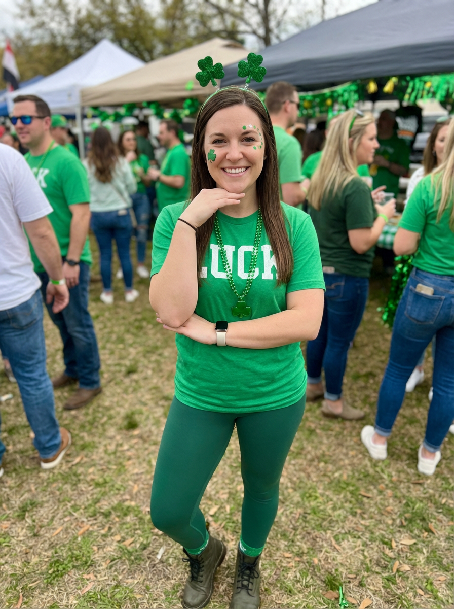 model with shamrock face paint, festival fun, green clothing, outdoor celebration