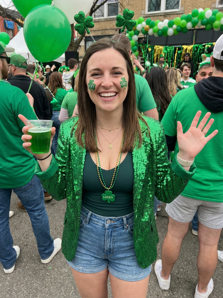 model with shamrock face paint, festival fun, green clothing, outdoor celebration
