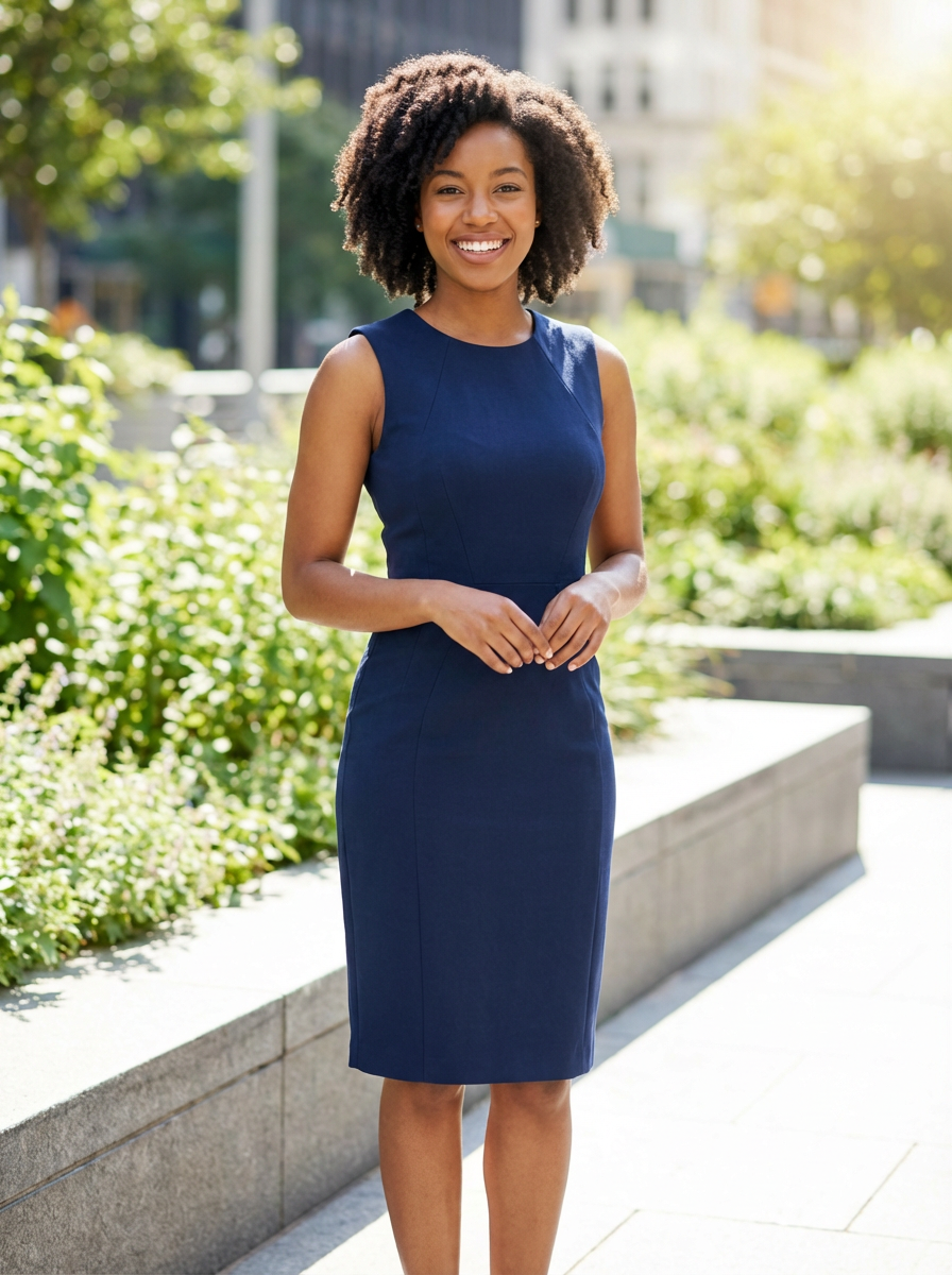 model with slim fit body, wearing fitted dress showing slim figure , happy confident expression