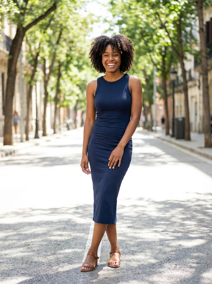 model with slim fit body, wearing fitted dress showing slim figure , happy confident expression