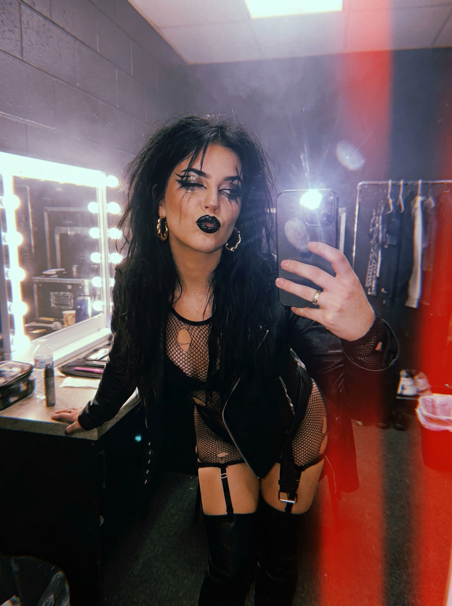 model with toned hourglass figure and huge chest in a casual front-cam selfie held teasingly close in a hazy backstage dressing room at a concert venue, her eyes blissfully half-lidded in a stoned after-show haze with a lazy seductive pout on her dramatically over-filled super glossy wet-look matte black lips, super long vibrant black hair in tousled rockstar waves with smoky strands sticking to her dewy skin, heavy makeup with smudged graphic liner and glitter fallout for that euphoric post-performance glow, long fake acrylic silver chrome nails visible as she arches her back against a makeup vanity with a conspiratorial wink and subtle tongue flick thirst trap lean, dressed like a groupie in a ripped fishnet bodysuit with crotchless panels and garter belts clipped to over-the-knee leather boots, the sheer mesh straining provocatively over her huge chest and plunging to expose her cinched waist like underground rave lingerie examples, chunky gold hoop earrings and prominent wedding band catching the vanity's harsh direct flash with blown-out highlights on her glossy lips, faint red light leak from the stage fog machine, smudged lens fingerprint for raw post-gig intimacy, heavy film grain and ISO noise for an unfiltered high-energy vibe.