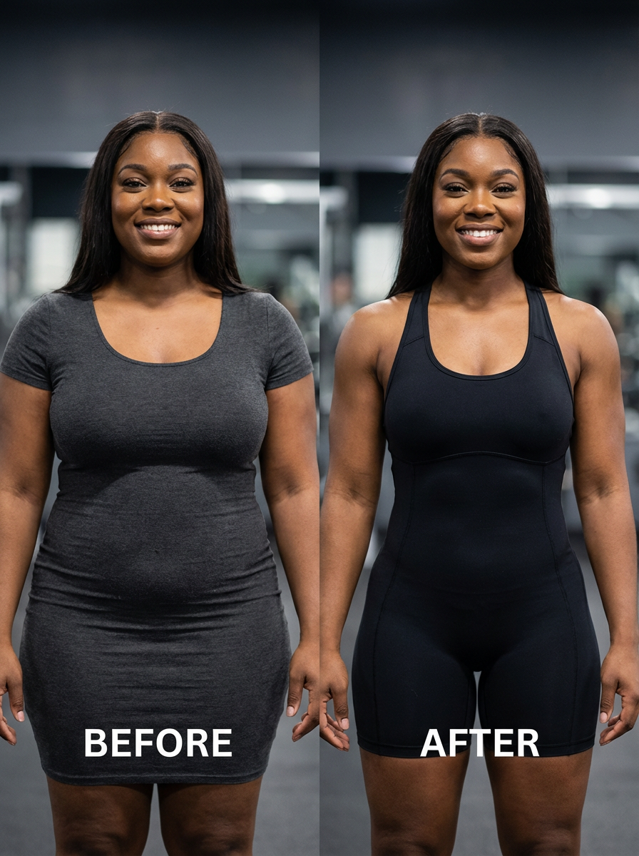 model with transformation physique, before and after energy, confident in bodycon outfit , proud expression