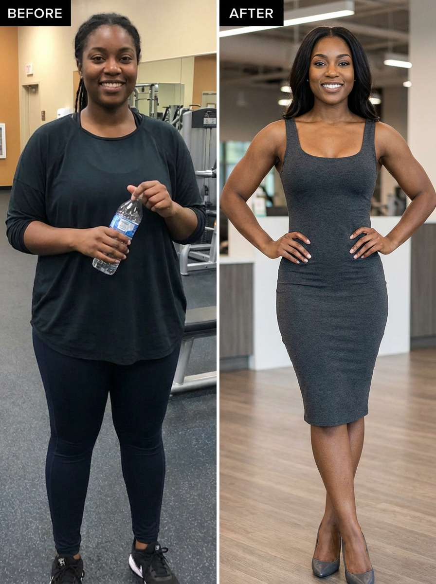 model with transformation physique, before and after energy, confident in bodycon outfit , proud expression