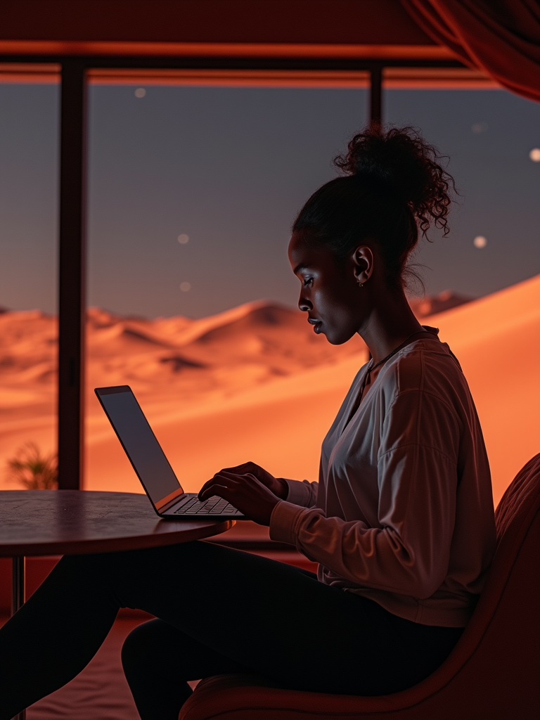 model working on a laptop indoor a co-working space on Mars at night. Mars red dunes is visible in big windows. model wears a casual blouse and black leggings.