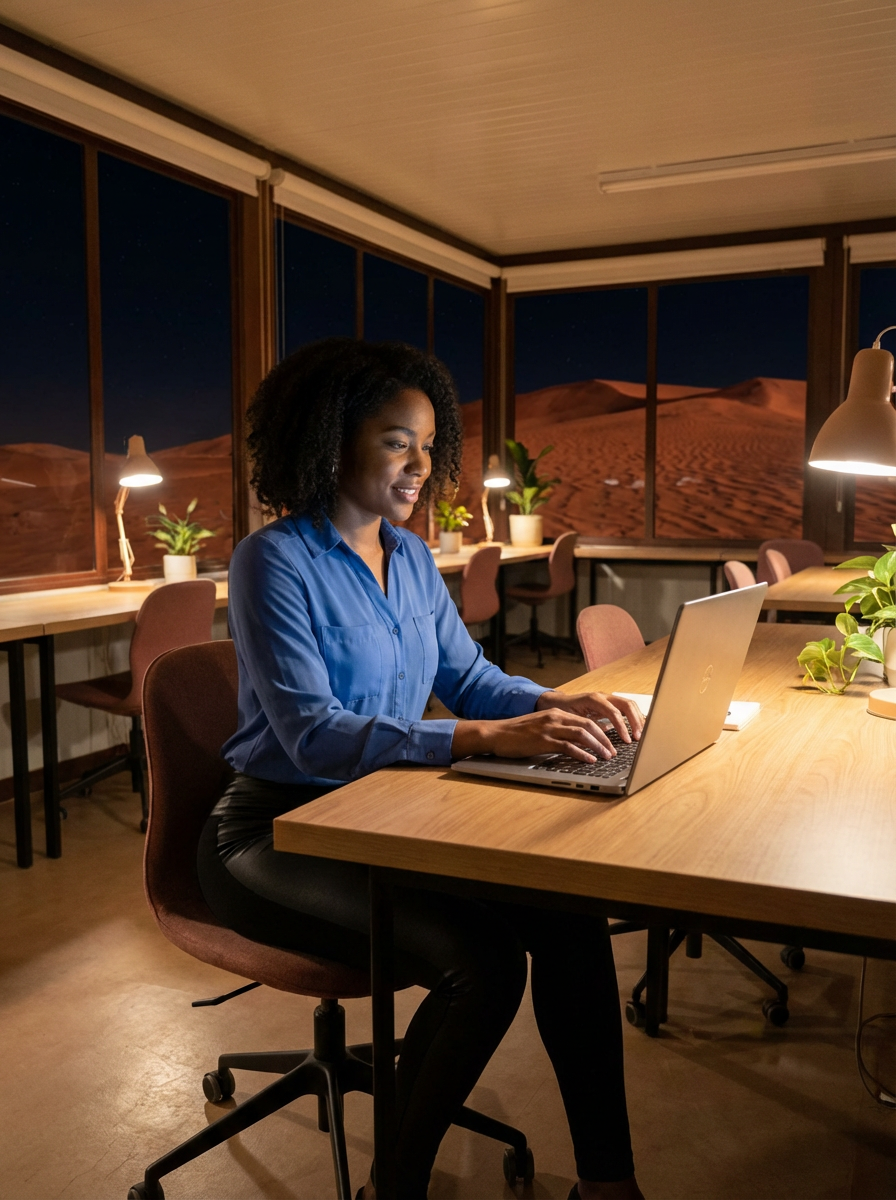 model working on a laptop indoor a co-working space on Mars at night. Mars red dunes is visible in big windows. model wears a casual blouse and black leggings.