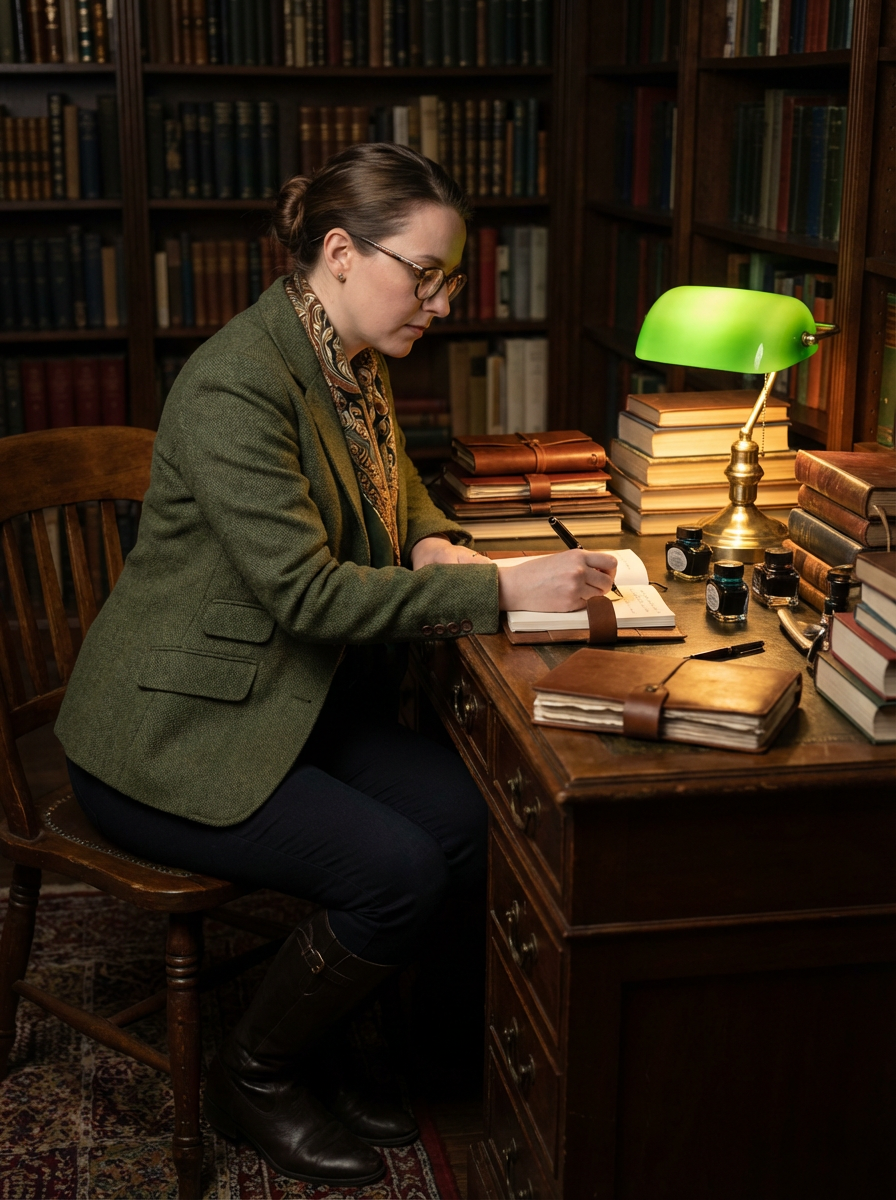 model writing with fountain pen, dark academia study, vintage desk lamp, leather-bound journals, scholarly atmosphere