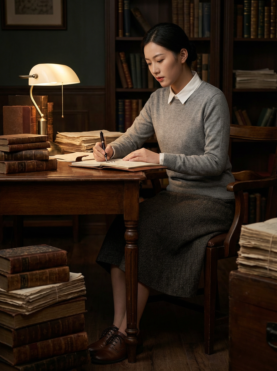 model writing with fountain pen, dark academia study, vintage desk lamp, leather-bound journals, scholarly atmosphere