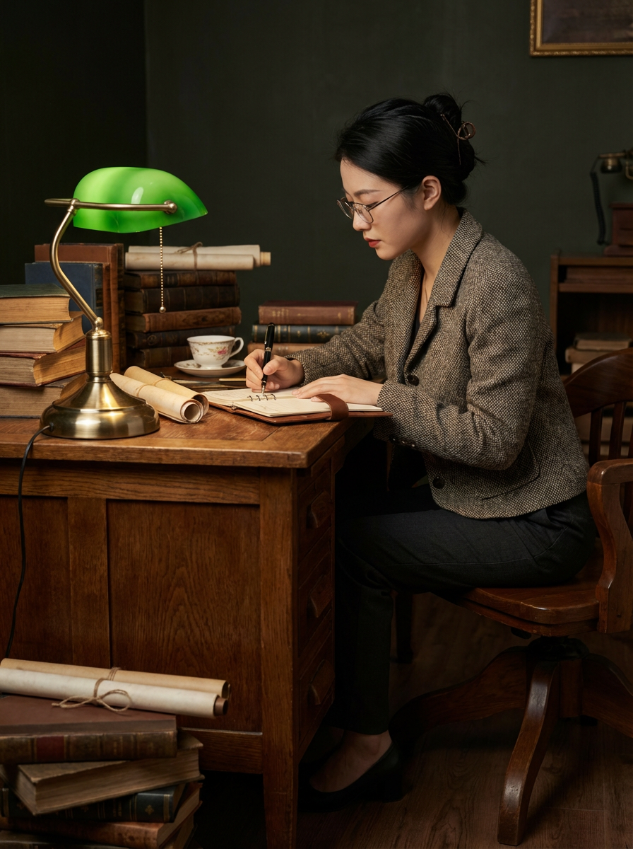 model writing with fountain pen, dark academia study, vintage desk lamp, leather-bound journals, scholarly atmosphere