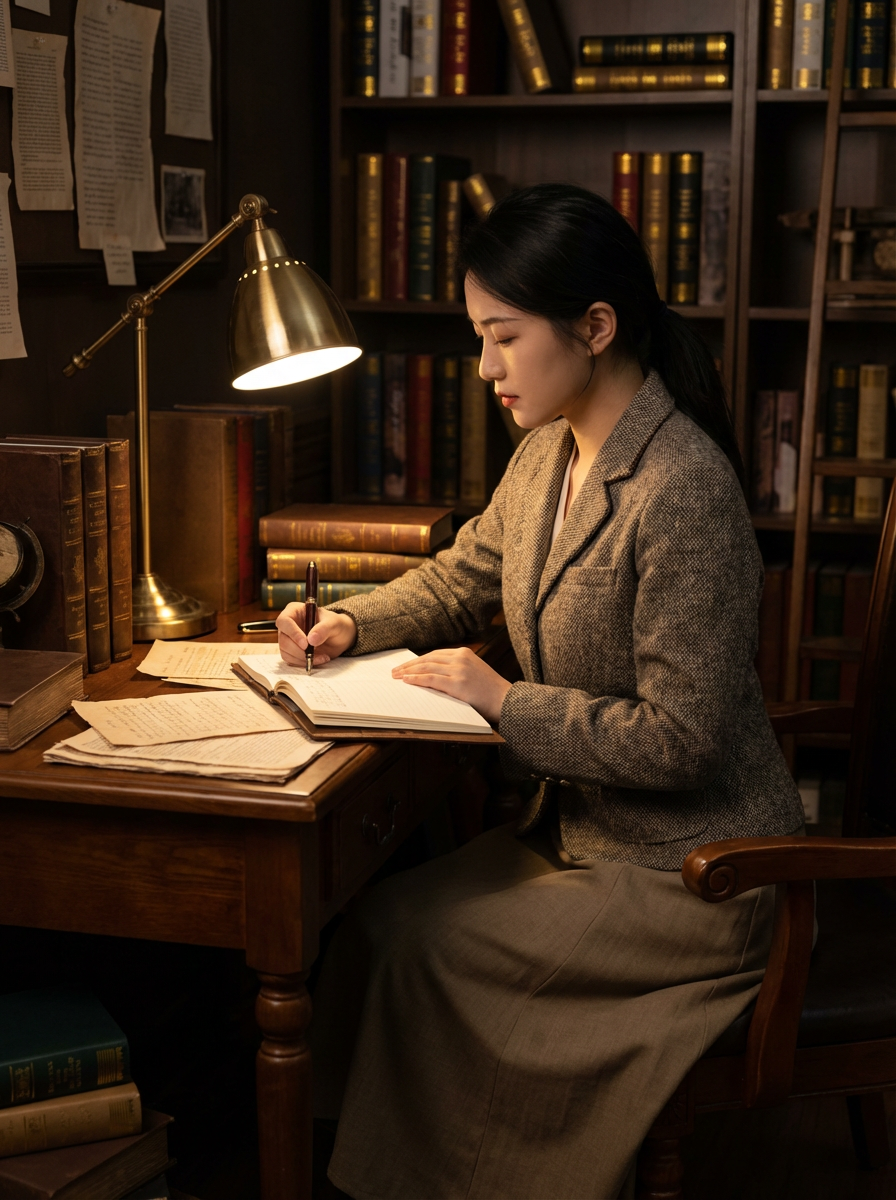 model writing with fountain pen, dark academia study, vintage desk lamp, leather-bound journals, scholarly atmosphere