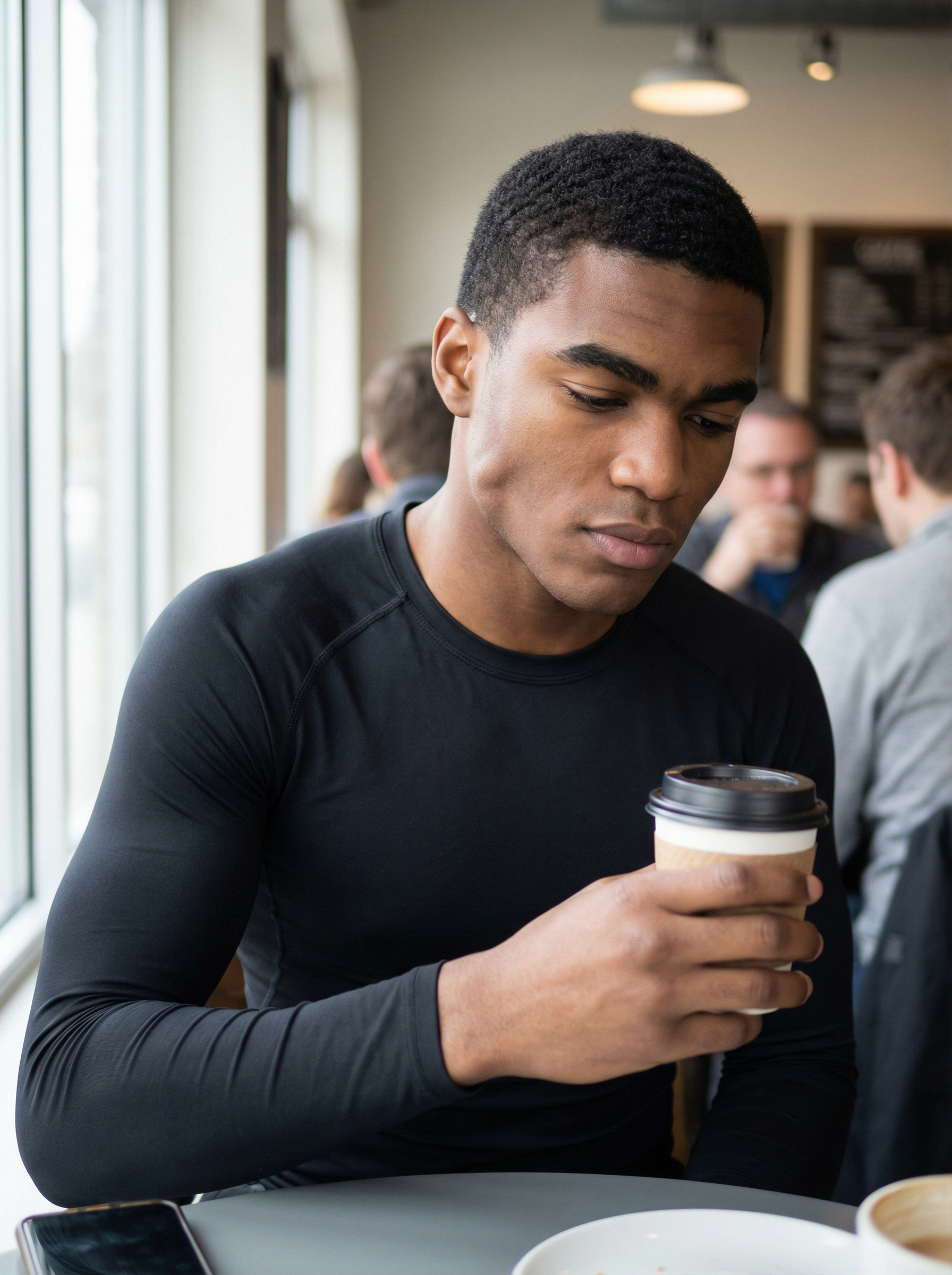 young looking model, active looksmaxxing cafe candid, elite looksmaxxing model, aesthetic build, sharp jawline even when looking down, high cheekbones, strong neck, thick brows, clear skin, calm stoic demeanor, wearing black long-sleeve compression top, holding takeaway coffee cup, looking down thoughtfully, “grindset/self-improvement” vibe, large window daylight, shallow depth of field, busy cafe background softly blurred, cinematic documentary grade,