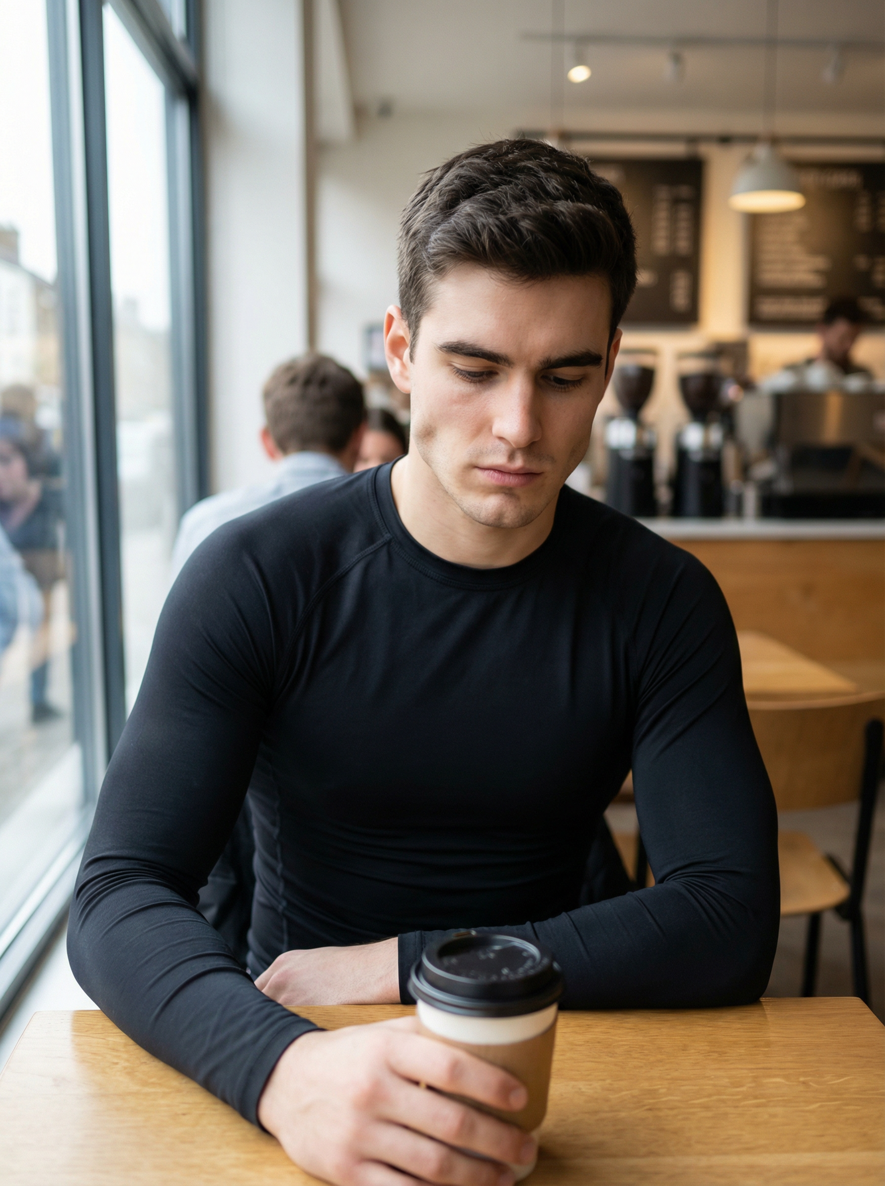 young looking model, active looksmaxxing cafe candid, elite looksmaxxing model, aesthetic build, sharp jawline even when looking down, high cheekbones, strong neck, thick brows, clear skin, calm stoic demeanor, wearing black long-sleeve compression top, holding takeaway coffee cup, looking down thoughtfully, “grindset/self-improvement” vibe, large window daylight, shallow depth of field, busy cafe background softly blurred, cinematic documentary grade,