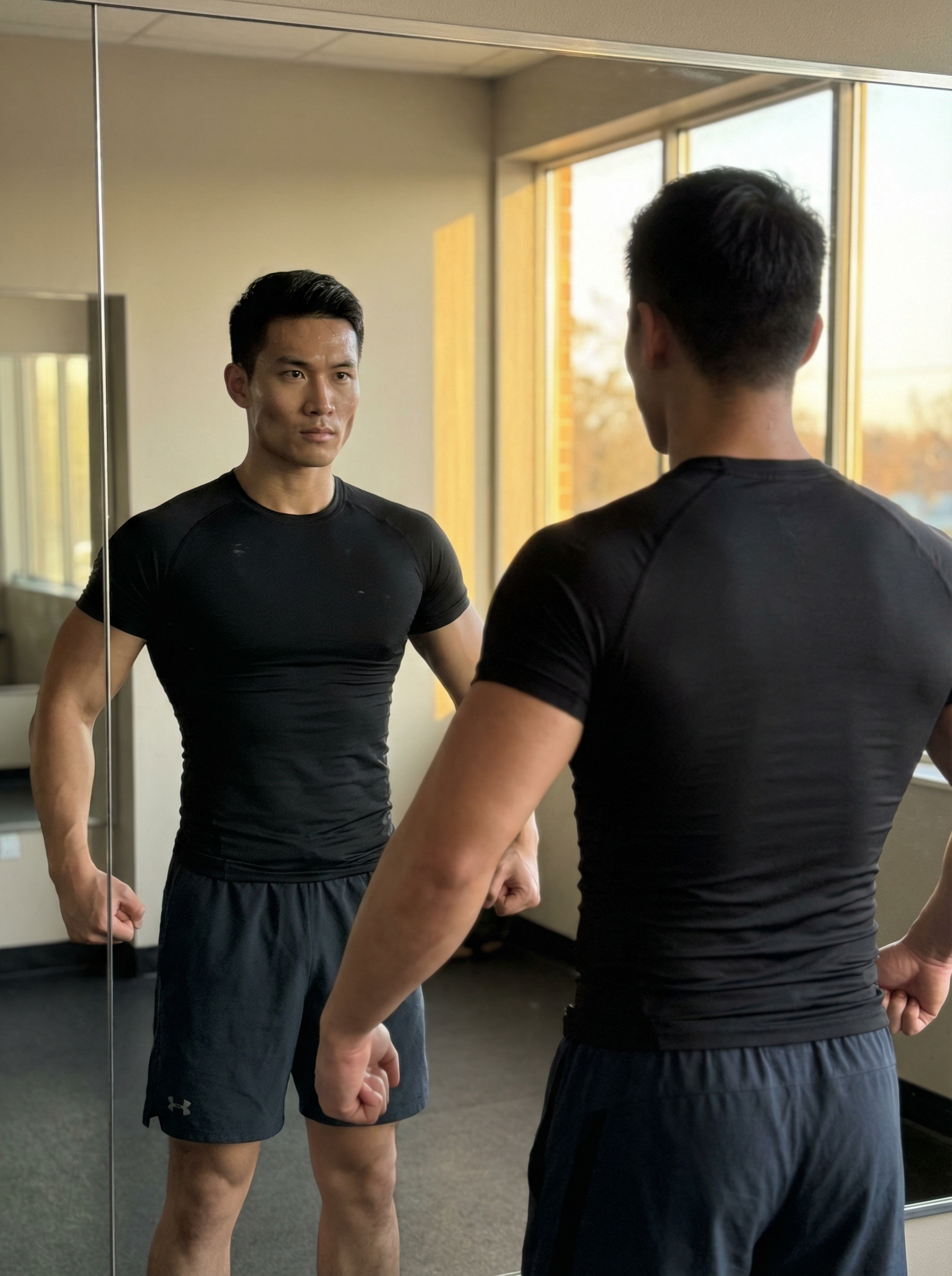 young looking model, active looksmaxxing confidence/power-poses in mirror, gym shorts + fitted top, muscular physique, shoulders open, thick neck, practicing power pose, chin neutral, determined “self-improvement” stare, sharp cheekbones + strong jawline emphasized, empowering cinematic lighting, ultra-detailed realism,