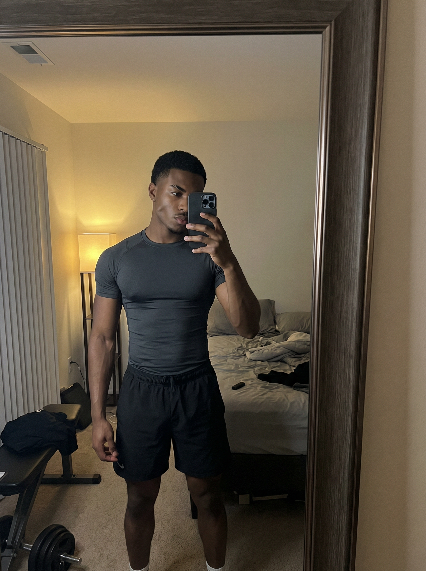 young looking model, active looksmaxxing full-body mirror selfie, elite looksmaxxing model, athletic muscular physique, low body fat, defined delts and arms, tapered waist, thick forearms, strong V-taper, symmetrical face, sharp jawline, high cheekbones, straight nose, groomed brows, clear glowing skin, wearing compression top + black athletic shorts, relaxed confident stance, slight hip shift, phone covering part of face, warm indoor lamp lighting, subtle shadows carving jaw/cheeks, “self-improvement era” aesthetic, realistic bedroom background, crisp focus,