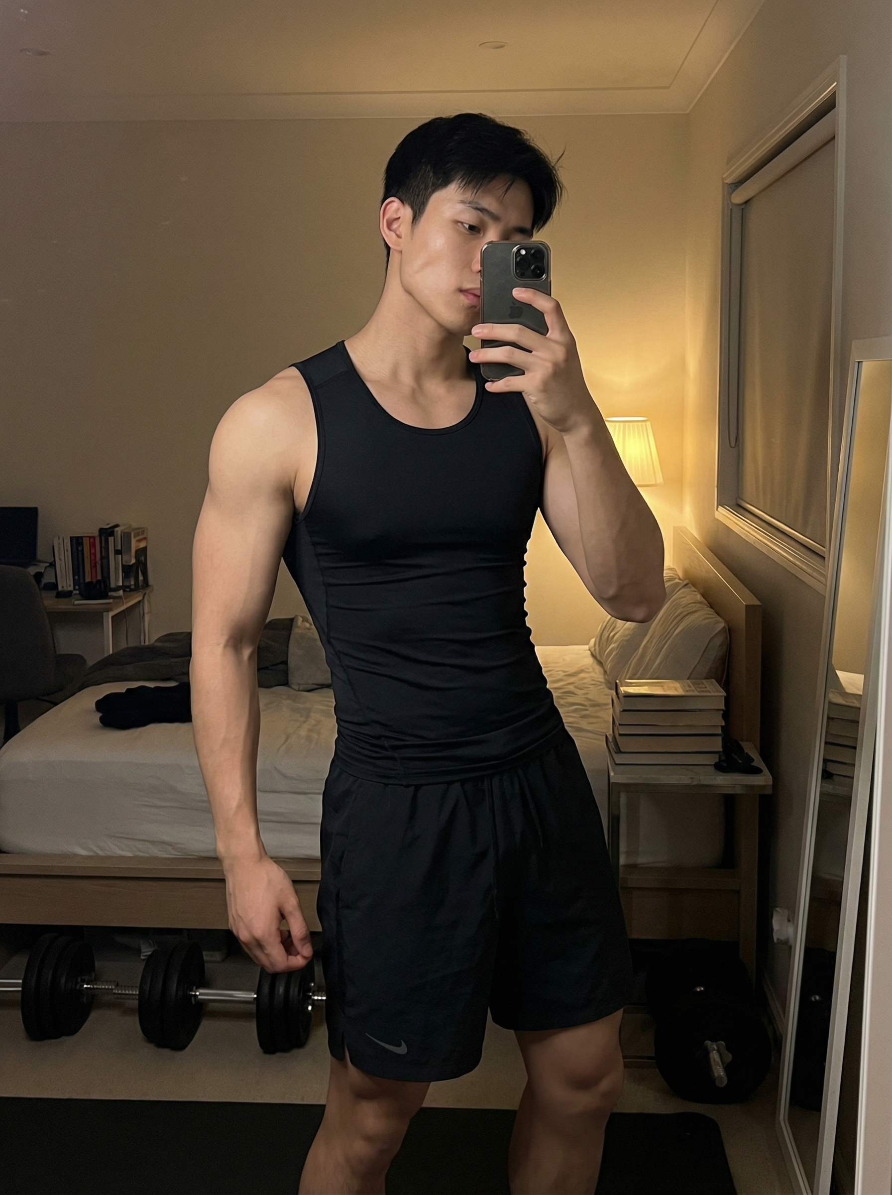 young looking model, active looksmaxxing full-body mirror selfie, elite looksmaxxing model, athletic muscular physique, low body fat, defined delts and arms, tapered waist, thick forearms, strong V-taper, symmetrical face, sharp jawline, high cheekbones, straight nose, groomed brows, clear glowing skin, wearing compression top + black athletic shorts, relaxed confident stance, slight hip shift, phone covering part of face, warm indoor lamp lighting, subtle shadows carving jaw/cheeks, “self-improvement era” aesthetic, realistic bedroom background, crisp focus,