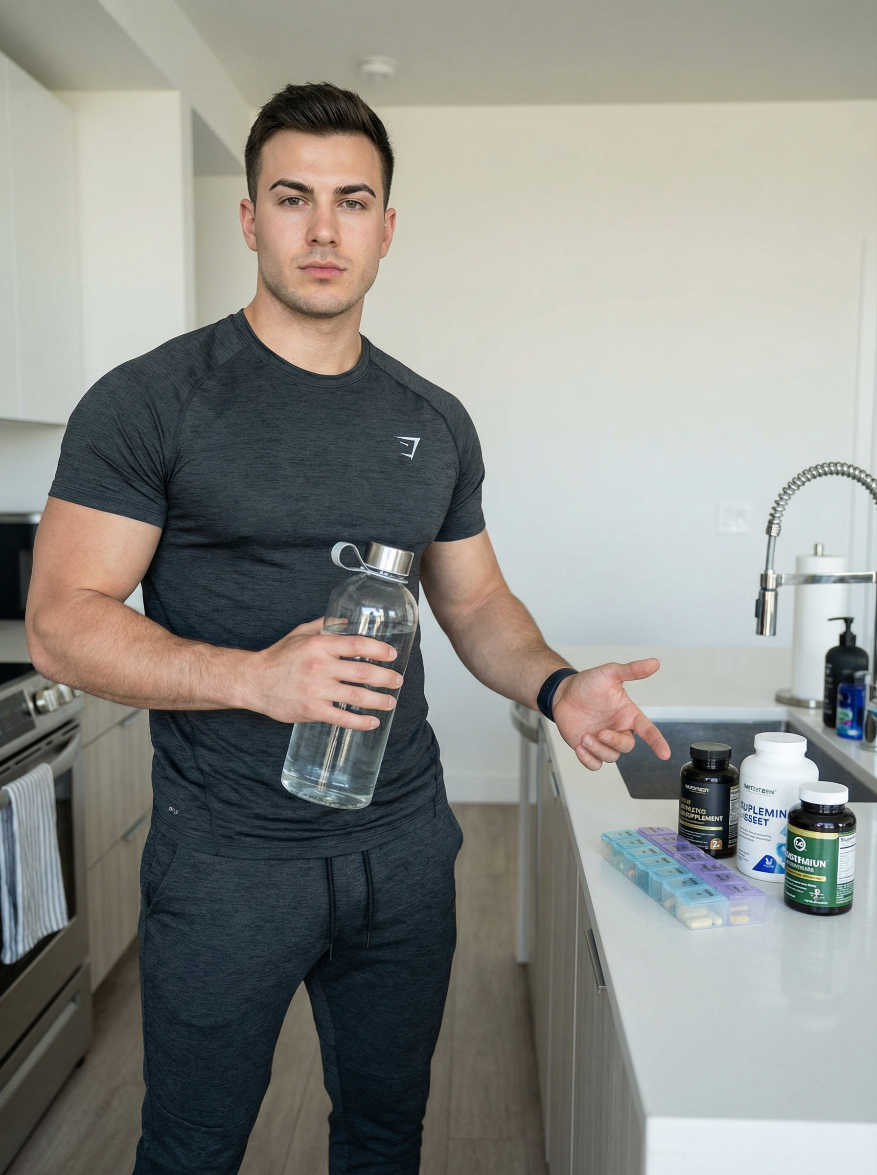 young looking model, active looksmaxxing hydration + supplements routine, fitted athleisure, muscular definition, thick neck, groomed brows, holding large water bottle, supplements neatly arranged, neutral expression, clear luminous skin, defined cheekbones, bright crisp lighting, premium wellness vibe,