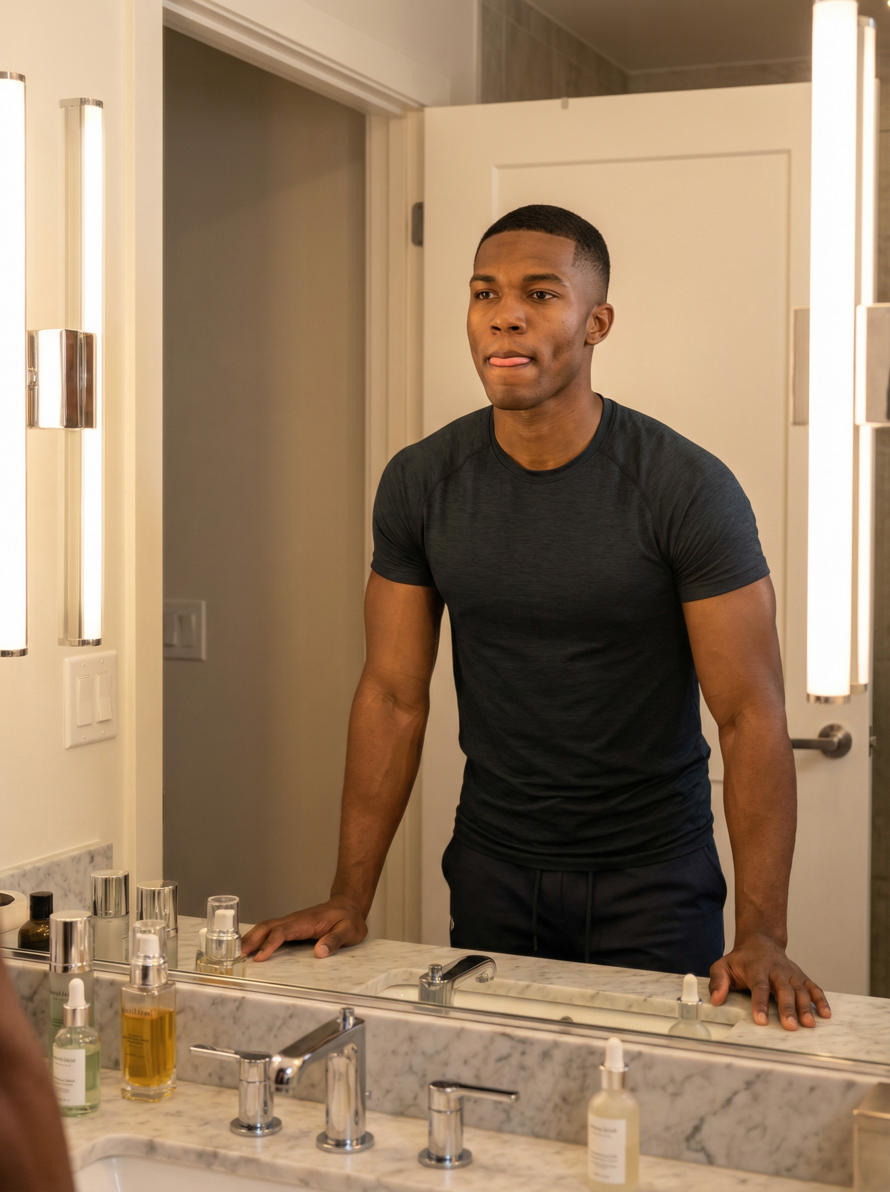 young looking model, active looksmaxxing luxury bathroom mirror shot, fitted gym tee + tapered joggers, fresh haircut, muscular build, big muscles, masculine,, low body fat, perfect vanity lighting, premium skincare bottles on counter, focused expression, doing subtle facial exercises / tongue posture (mewing) naturally, razor jawline + high cheekbones clearly defined, crisp pores, cinematic realism, no distortion,