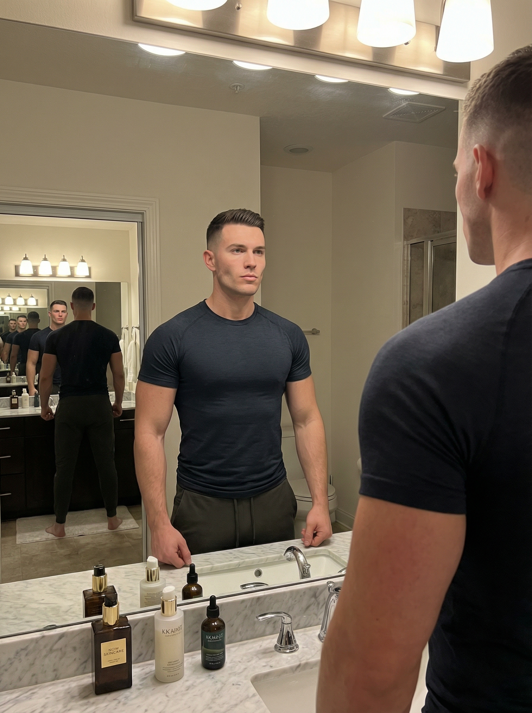 young looking model, active looksmaxxing luxury bathroom mirror shot, fitted gym tee + tapered joggers, fresh haircut, muscular build, big muscles, masculine,, low body fat, perfect vanity lighting, premium skincare bottles on counter, focused expression, doing subtle facial exercises / tongue posture (mewing) naturally, razor jawline + high cheekbones clearly defined, crisp pores, cinematic realism, no distortion,