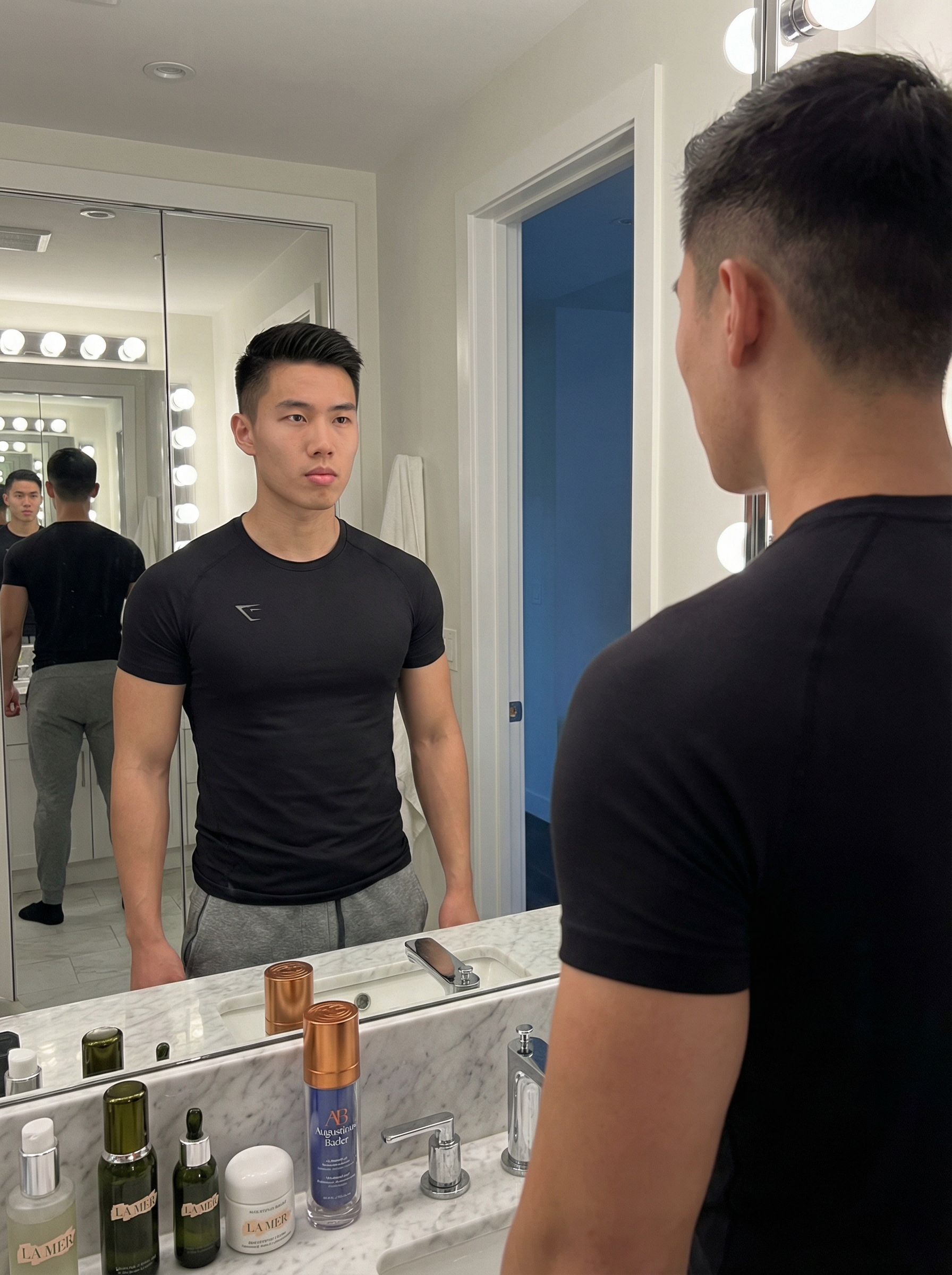 young looking model, active looksmaxxing luxury bathroom mirror shot, fitted gym tee + tapered joggers, fresh haircut, muscular build, big muscles, masculine,, low body fat, perfect vanity lighting, premium skincare bottles on counter, focused expression, doing subtle facial exercises / tongue posture (mewing) naturally, razor jawline + high cheekbones clearly defined, crisp pores, cinematic realism, no distortion,