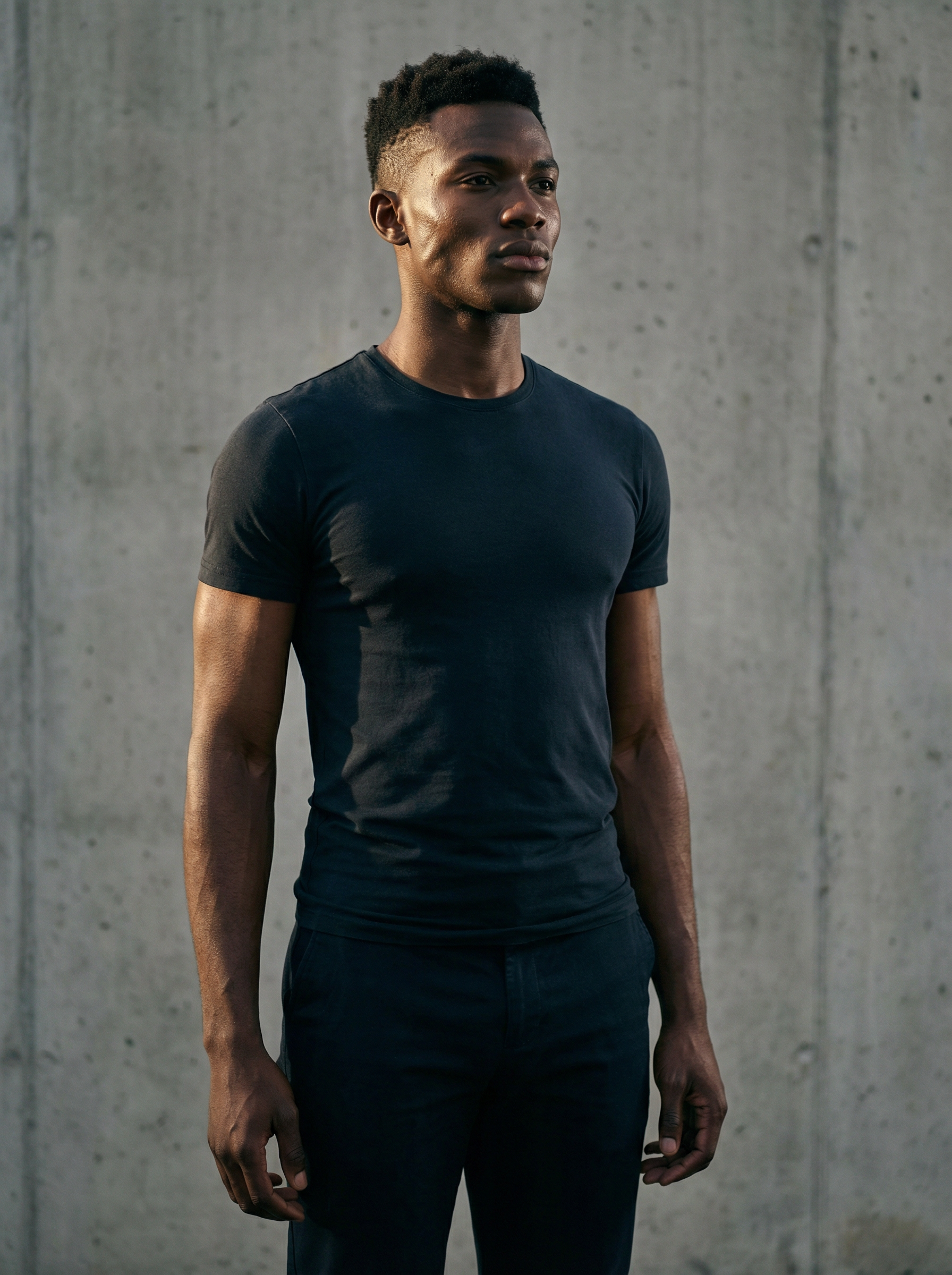 young looking model, active looksmaxxing posture training, fitted tee and trousers, muscular physique, thick neck, shoulders back, practicing perfect posture against a wall, aligned spine, chin neutral, confident commanding gaze, sharp jawline + high cheekbones emphasized by side light, motivational cinematic lighting, ultra-real skin texture,
