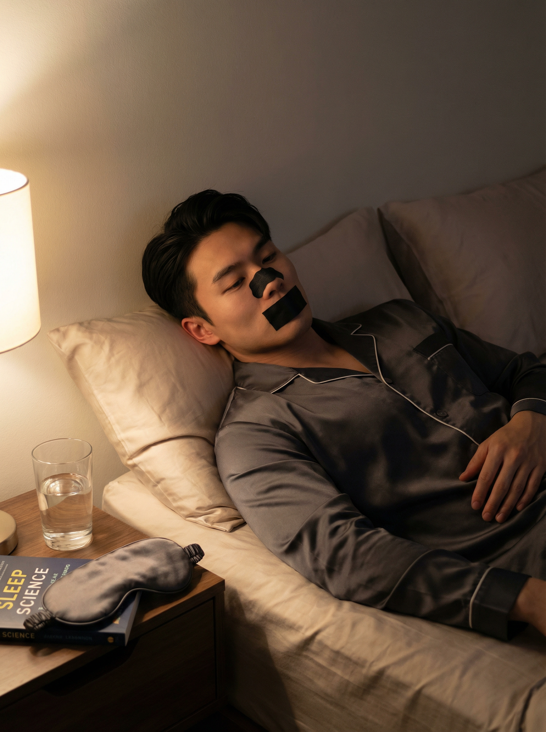 young looking model, active looksmaxxing sleep optimization setup, premium sleepwear, muscular frame, clean haircut, calm bedroom with silk pillowcase, sleep mask nearby, black nose strips and black mouth tape, peaceful expression, rested face with no puffiness (jawline + cheekbones still defined), dim cinematic lighting, ultra-real texture,